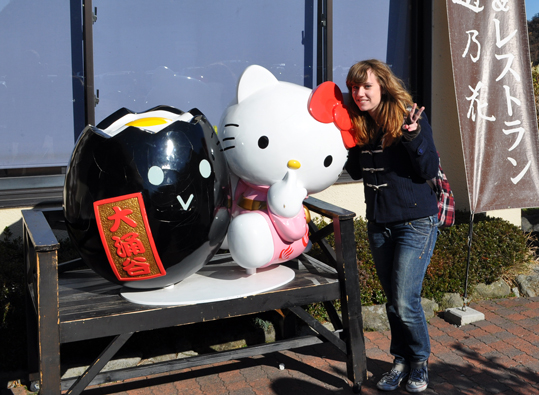 Something that you cannot escape at Japanese tourist sights is Hello Kitty. There are Hello Kitty phone charms for every Japanese thing you can possibly think of. So James decided to eat his black egg beside the black egg Hello Kitty. Makes sense, really.